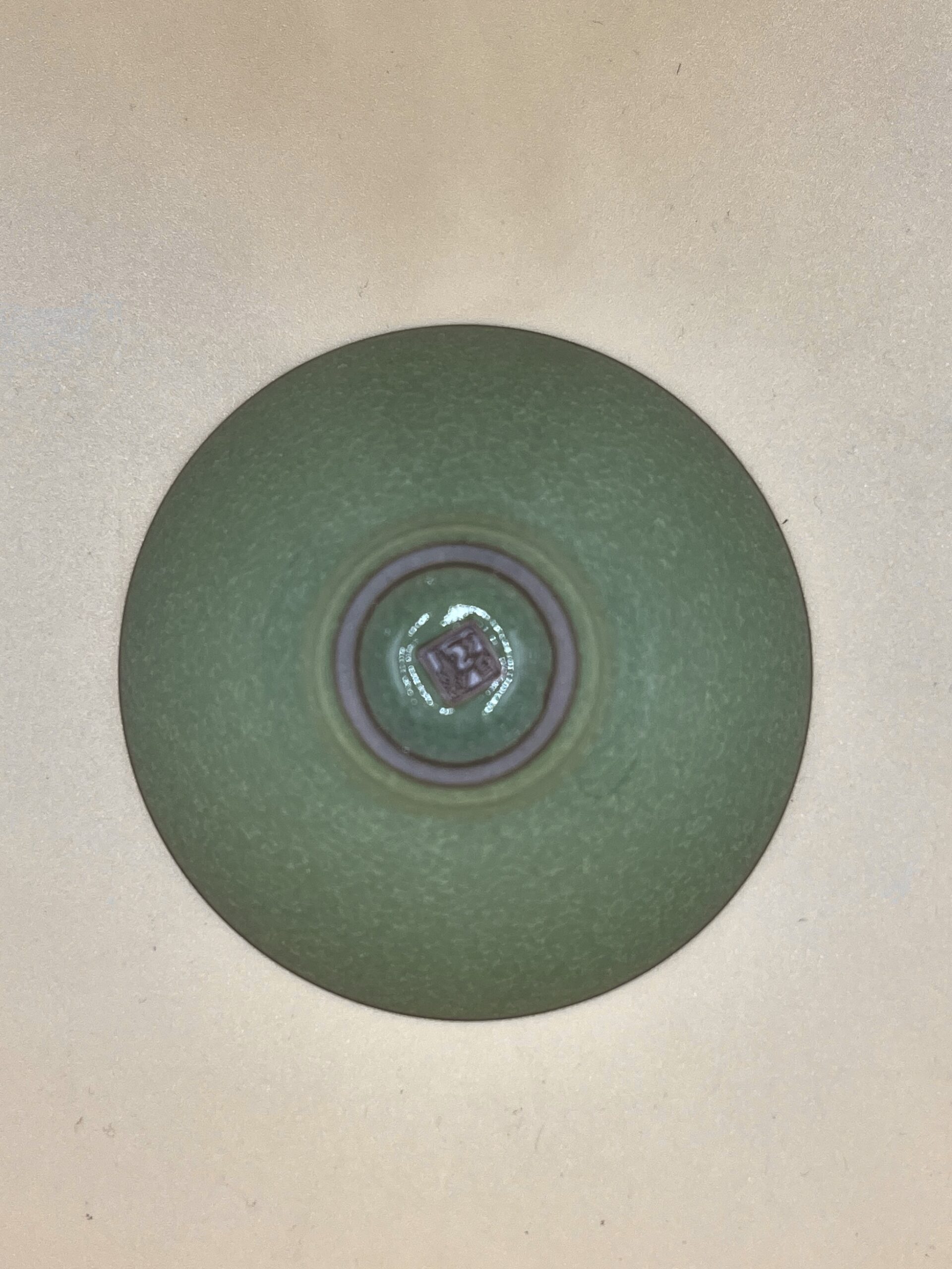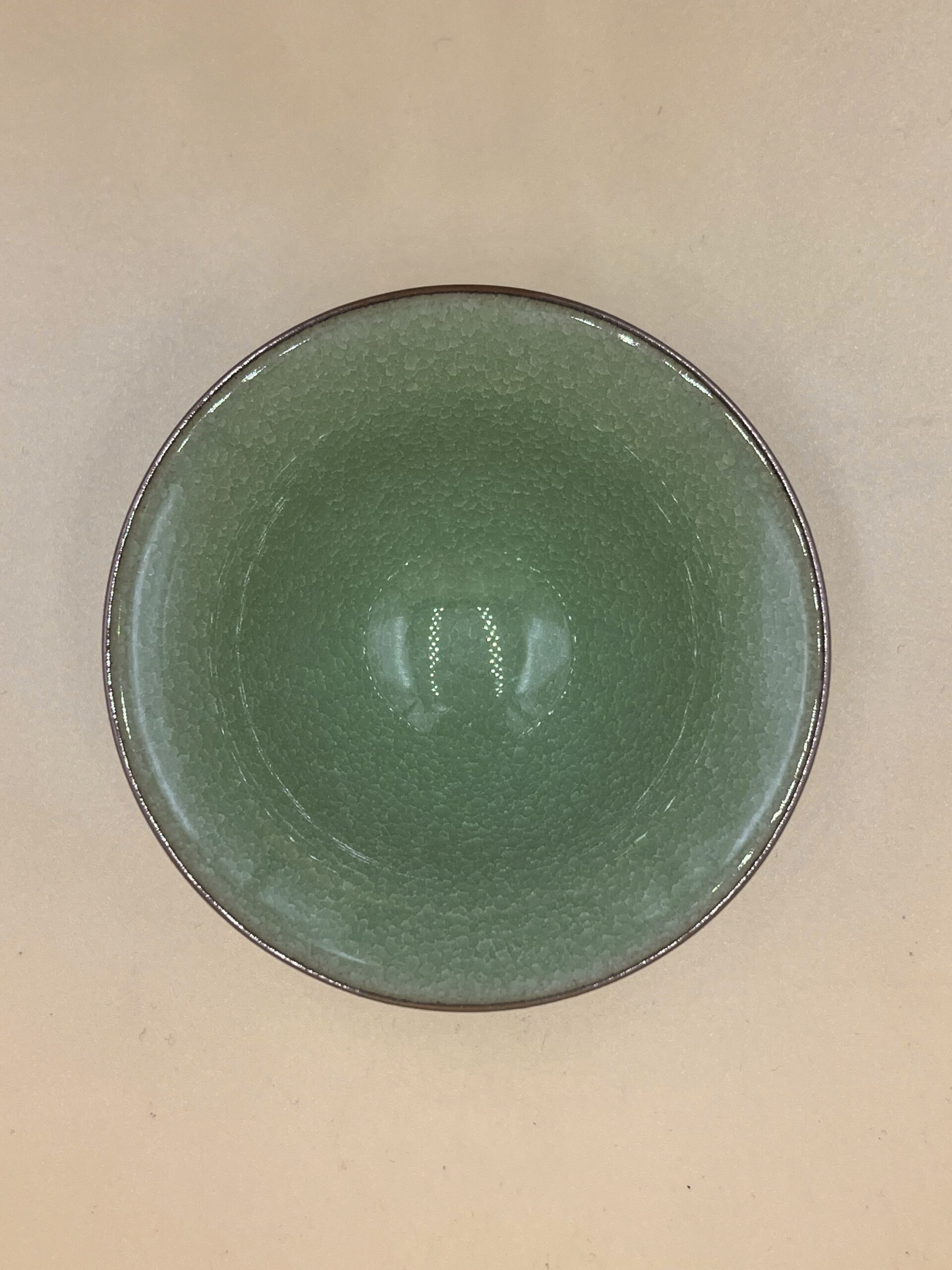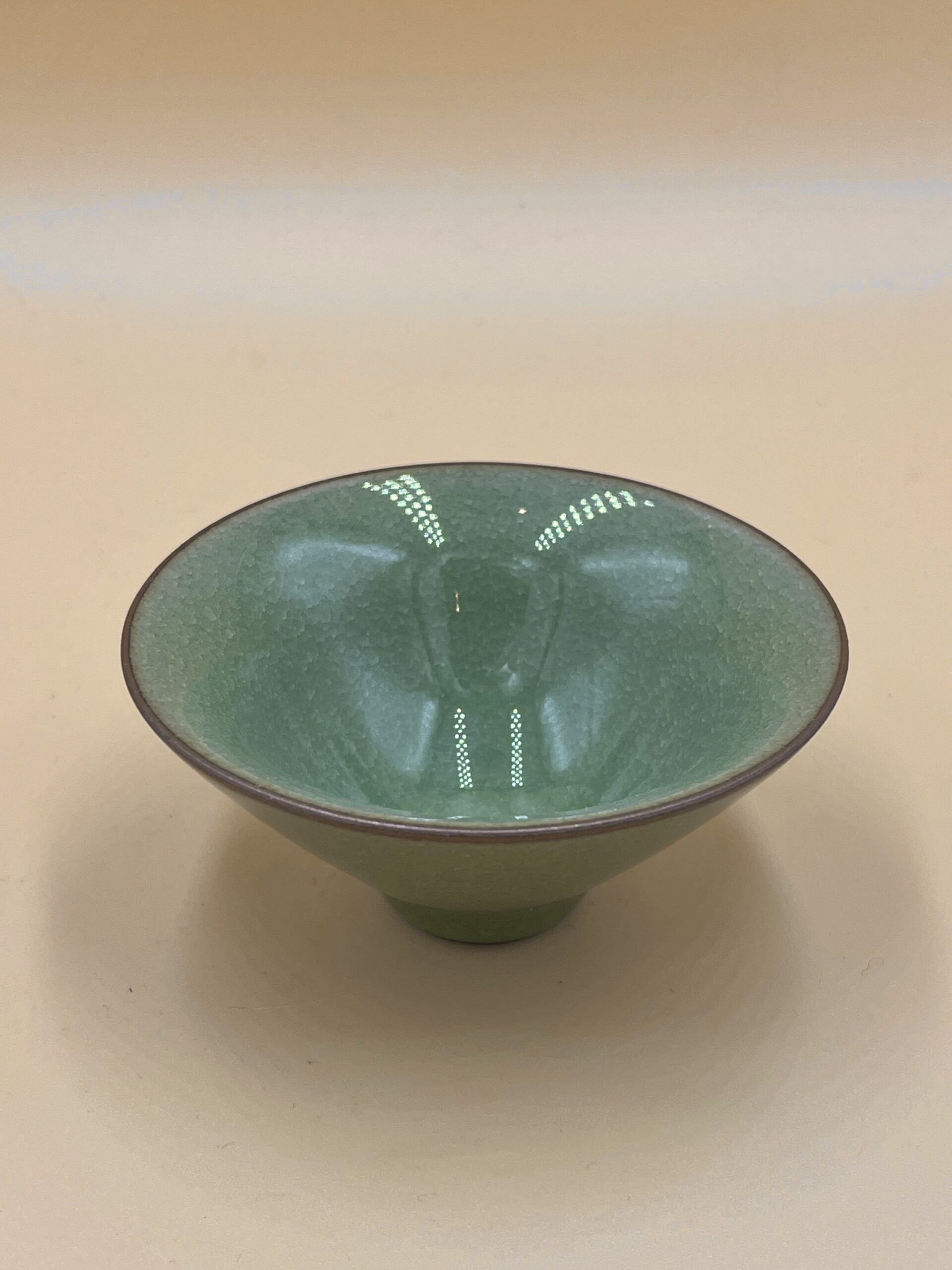 Конусообразная пиала керамики Лунцюань с невероятным мелким снежно-ледяным окрасом глазури. Приглушённый изумрудный оттенок с белыми узорами глазури.
