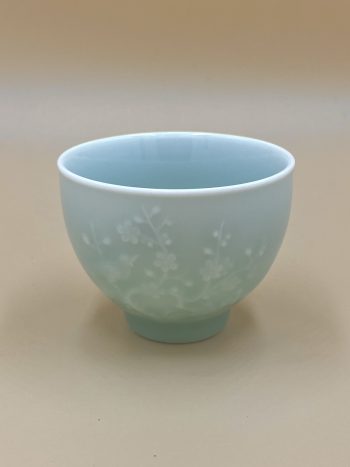Объемная пиала произведение искусства Лунцюань. Серо-голубой чистый оттенок глазури, глиняная основа пиалы видна сквозь трещинки.