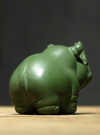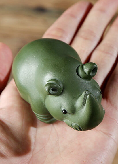 Небольшая чайная фигурка доброго носорога. На фотографиях может выглядеть устрашающе – носорог в китае символизирует защиту, в жизни выглядит миловидно и обтекаемо. Зелёный цвет добавляет ему мудрости и дипломатичности, согласно китайской символике цвета. При обильном поливе водой начинает пускать пузыри изо рта.